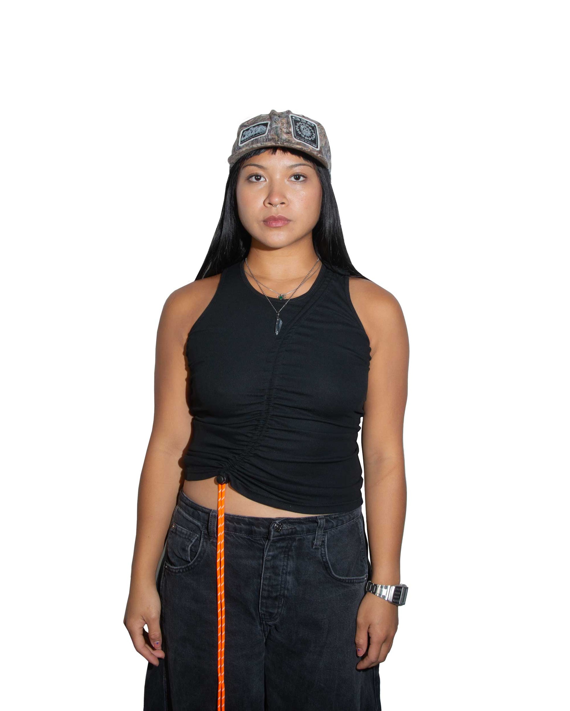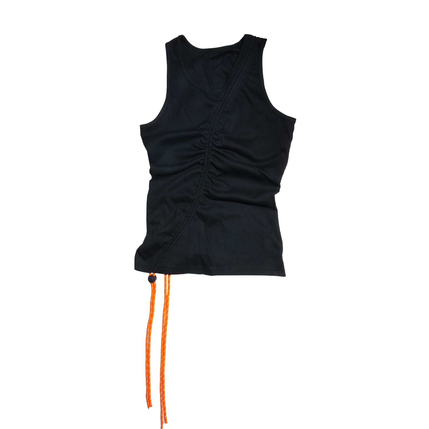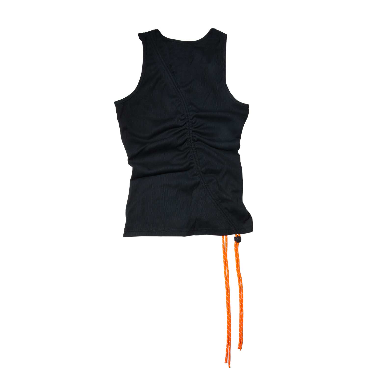 Unisex tank top with stretch rib-knit for flexible fit, and orange hi-vis 3M drawcords. Fully adjustable front and back ruching.