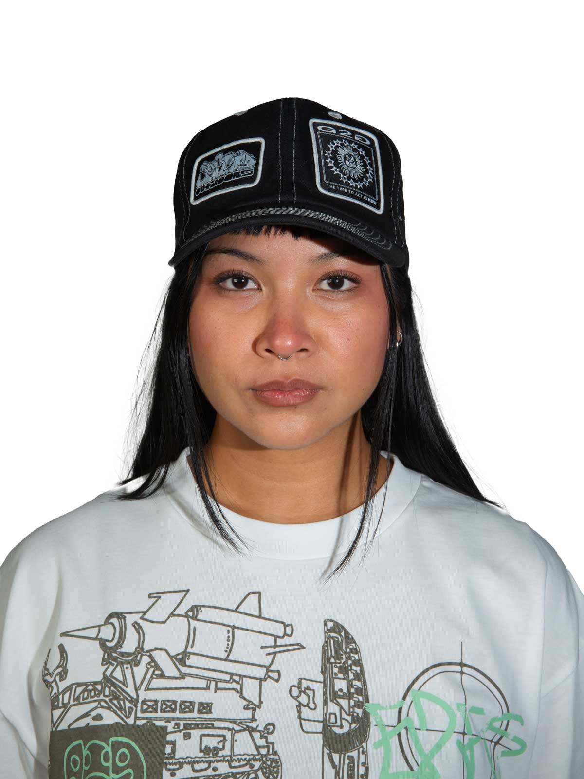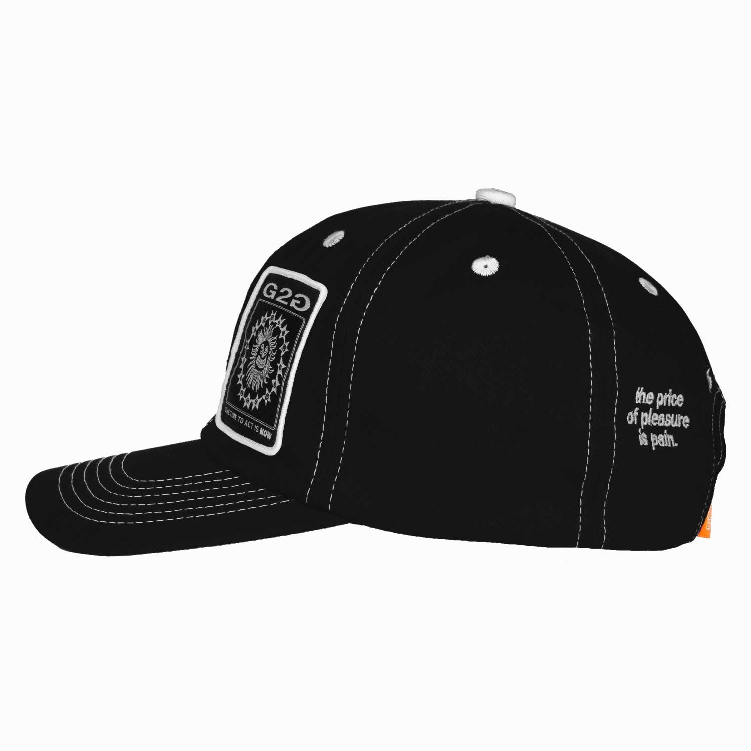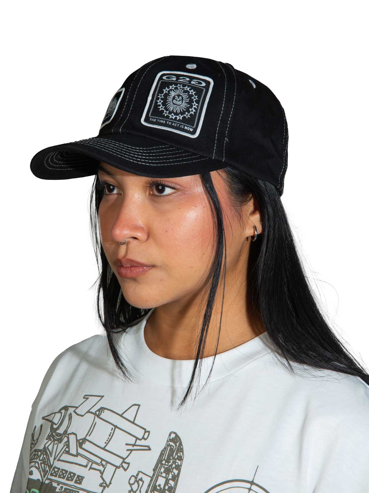 6 panel unstructured cap with embroidered graphic, patchwork, and woven g2g label