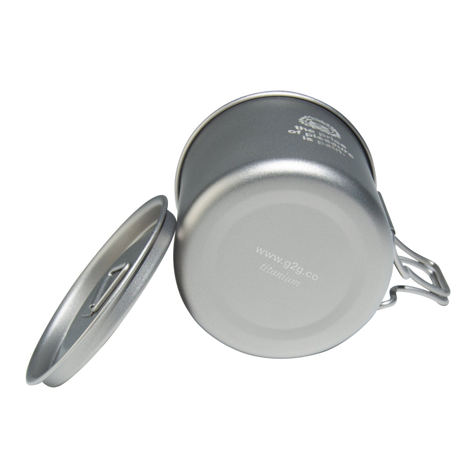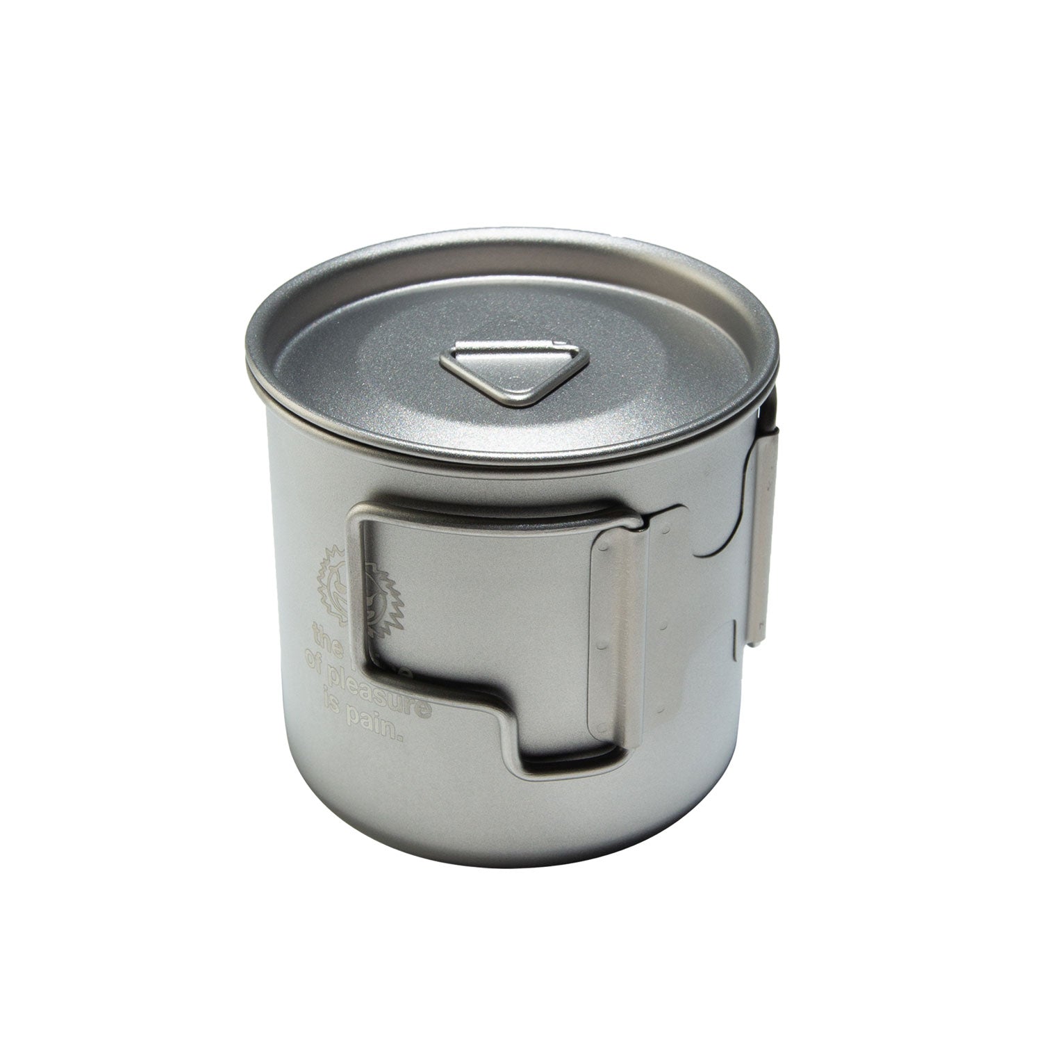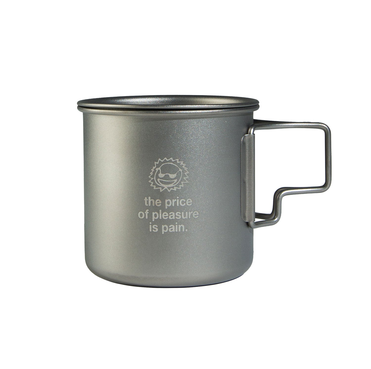 Titanium alloy camping mug laser etched with front and bottom graphic.
