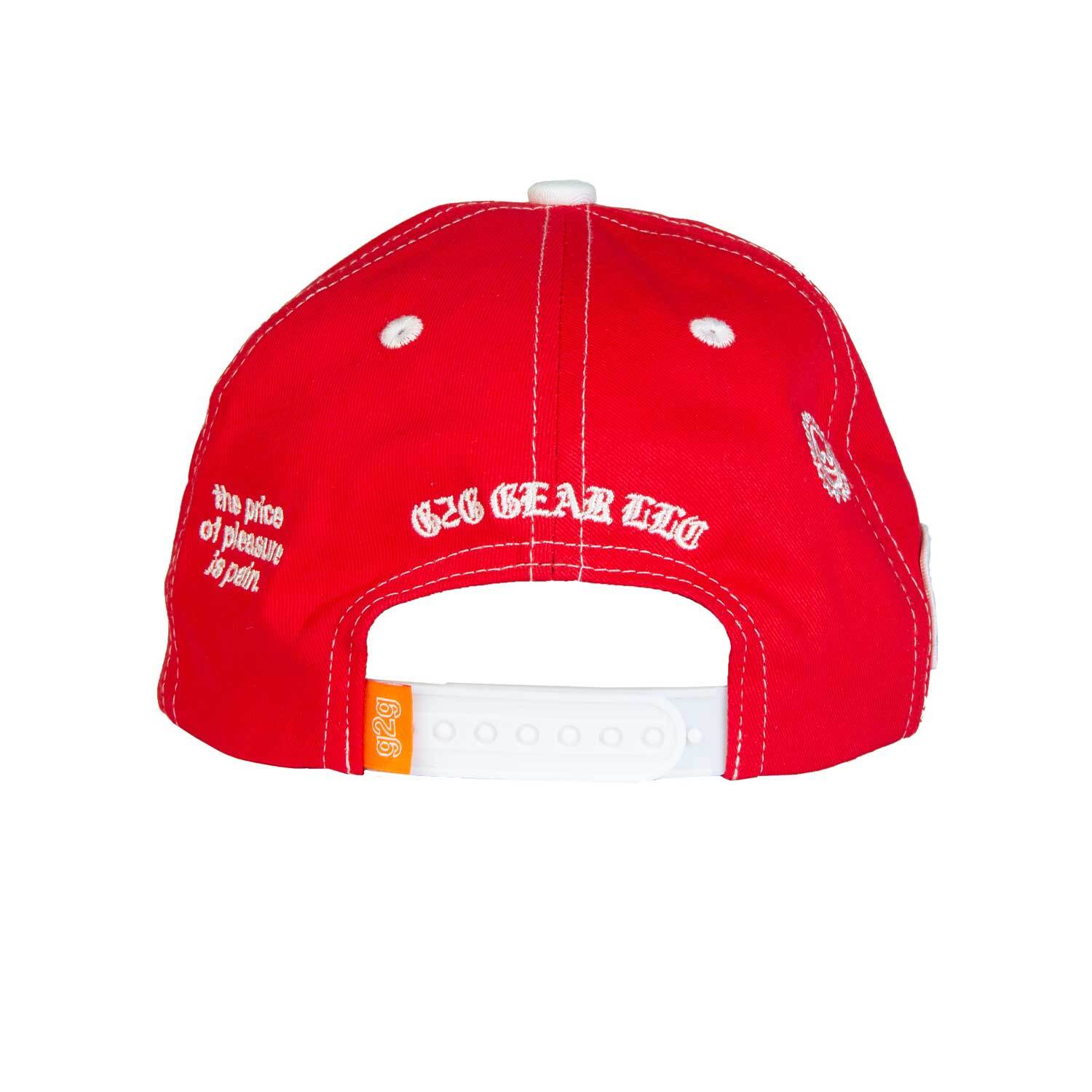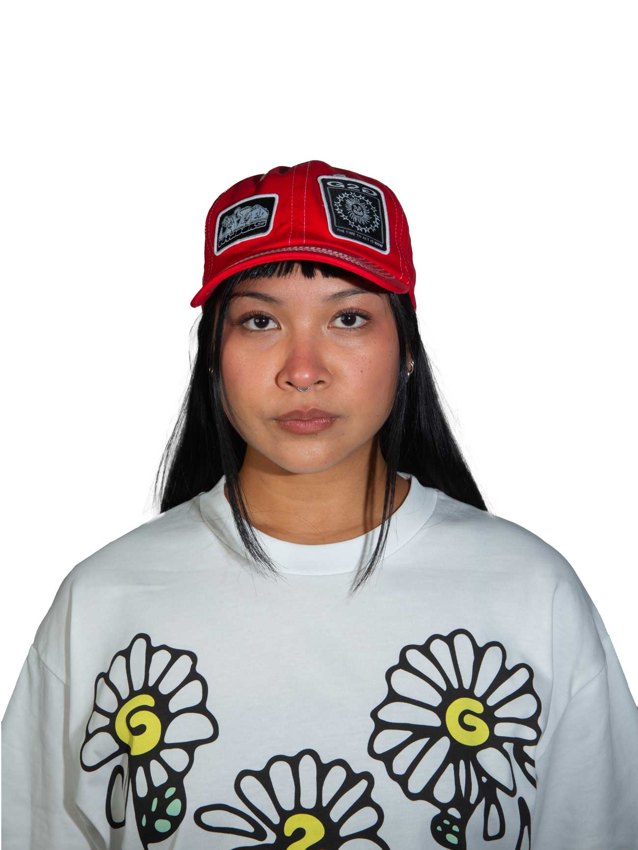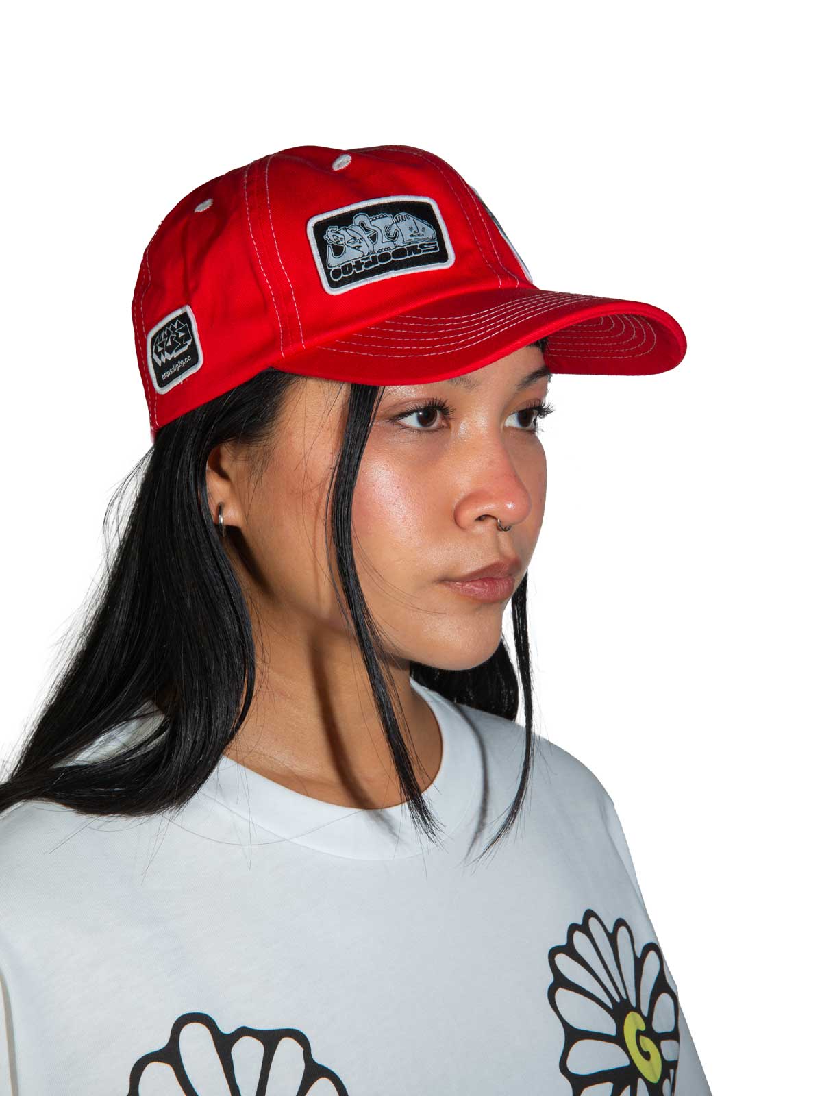6 panel unstructured cap with embroidered graphic, patchwork, and woven g2g label.